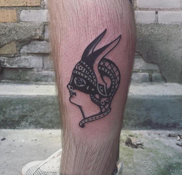 男生小腿上黑色几何简单线条蒙面人物纹身图片