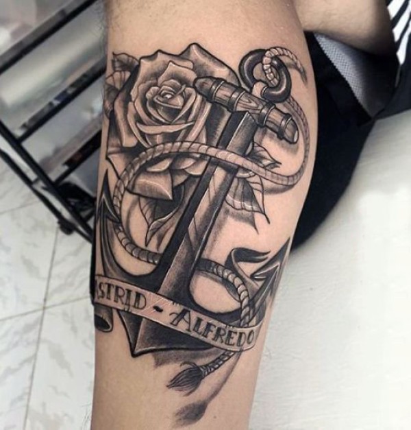 男生小腿上黑灰素描点刺技巧创意唯美花朵船锚纹身图片