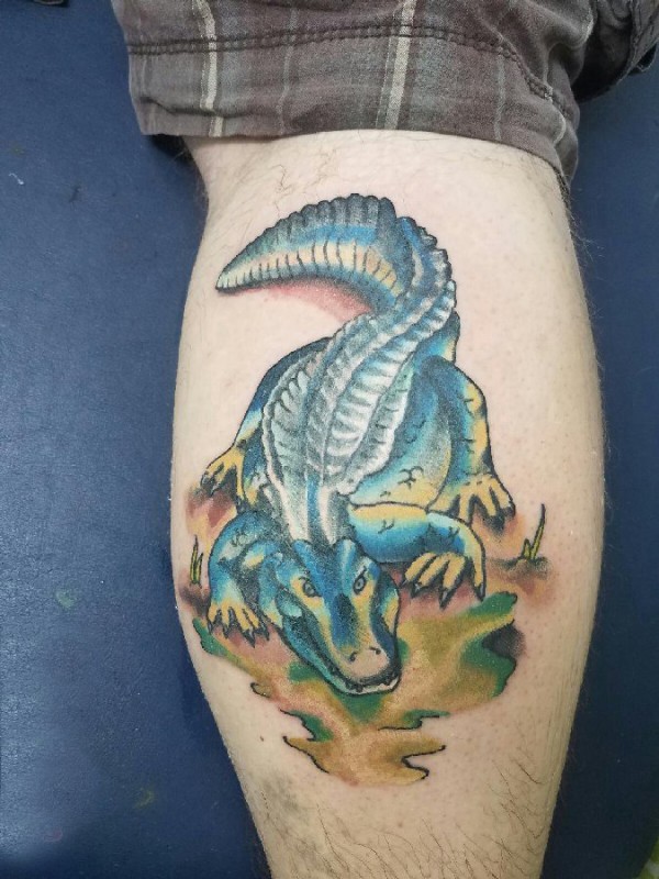 男生小腿上彩绘渐变抽象线条小动物鳄鱼纹身图片