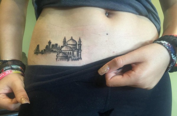 女生侧腰上黑色点刺几何简单线条建筑物纹身图片