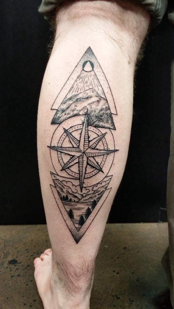 男生小腿上黑灰素描点刺技巧创意指南针风景纹身图片