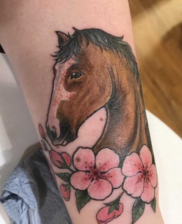 男生小腿上彩绘渐变简单线条植物花朵和马纹身图片