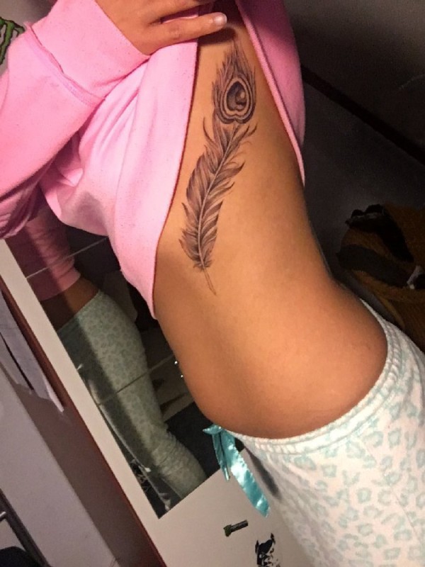 女生侧腰上黑灰素描点刺技巧创意孔雀羽毛纹身图片