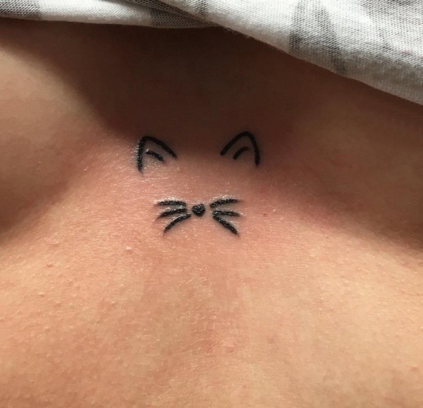 女生胸口上黑色线条创意精致猫咪纹身图片