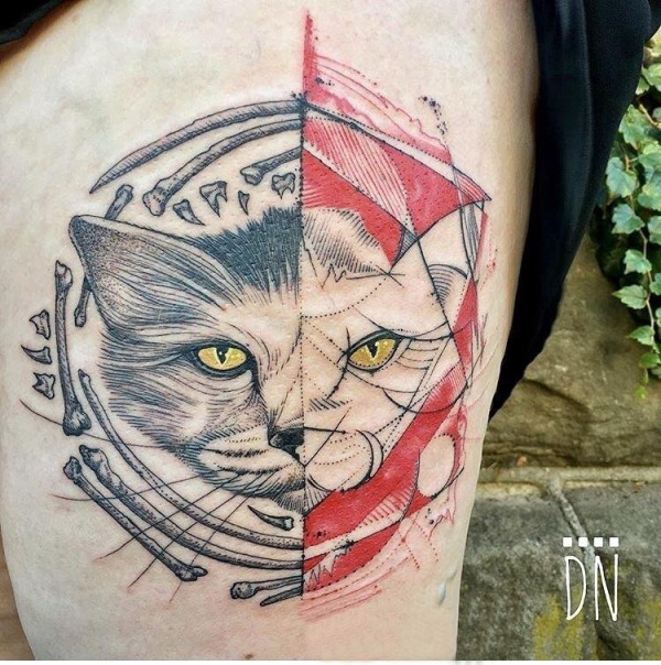 女生大腿上彩绘简单抽象线条拼接小动物猫咪纹身图片