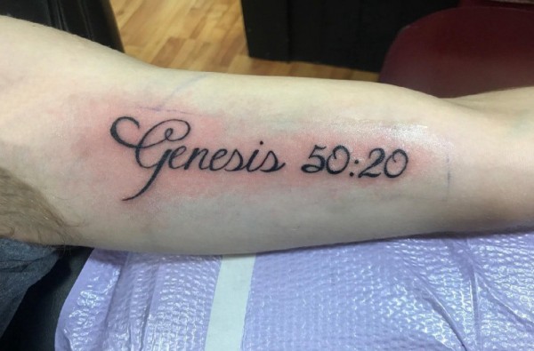 男生手臂上黑色抽象线条英文和数字纹身图片