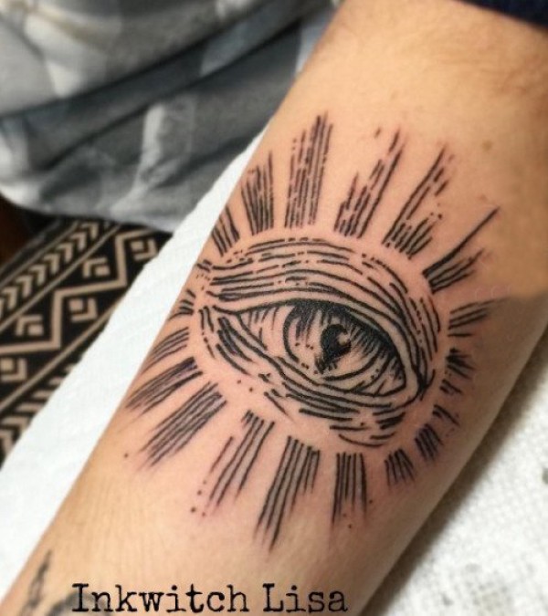 男生手臂上黑灰素描创意上帝之眼纹身图片