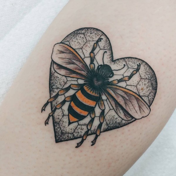 男生手臂上彩绘点刺简单线条心形和昆虫蜜蜂纹身图片