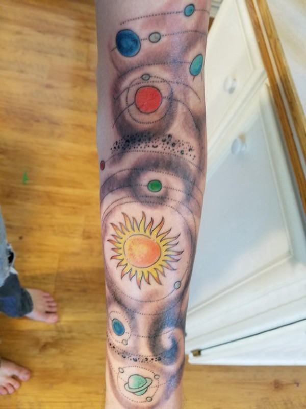男生手臂上彩绘渐变几何简单线条创意星球宇宙纹身图片