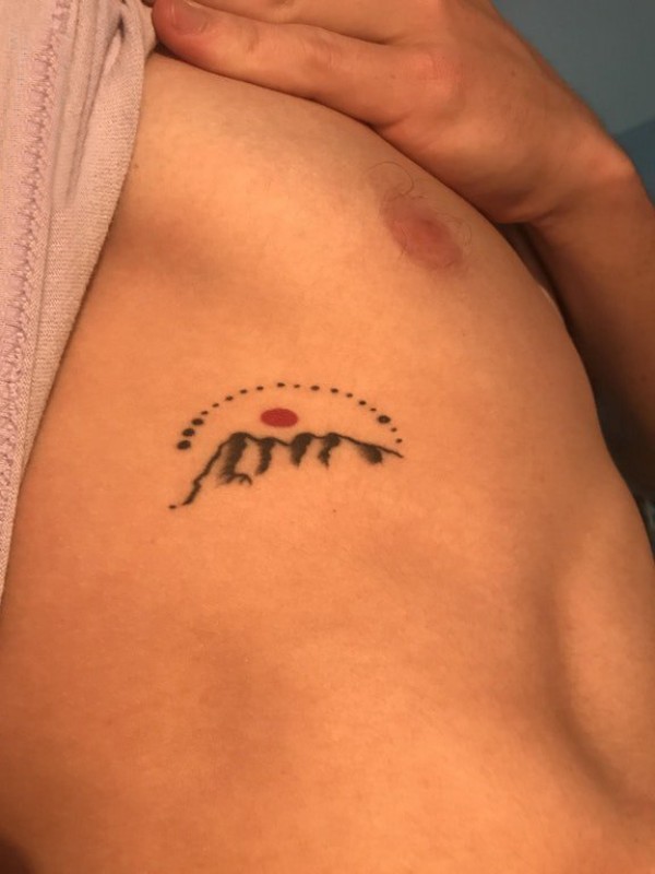 男生侧腰上彩绘简单线条太阳和山脉纹身图片