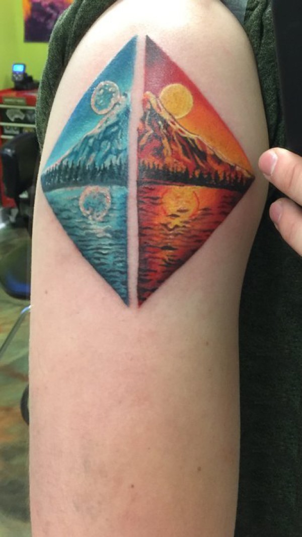 男生手臂上彩绘渐变几何简单线条创意山水风景纹身图片
