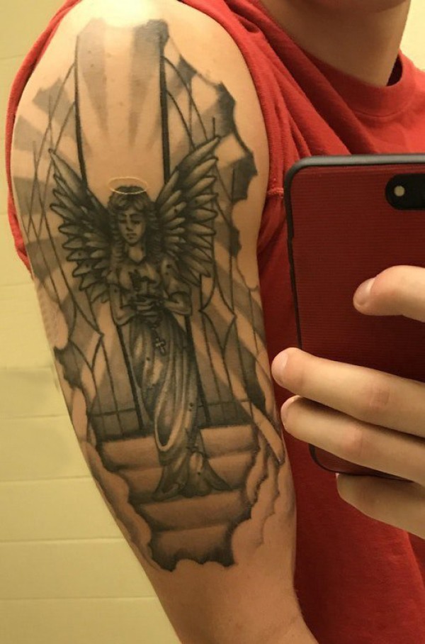 男生手臂上黑灰点刺几何简单线条天使纹身图片