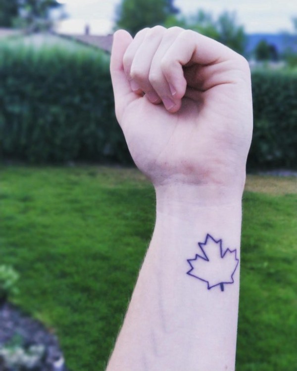 女生手腕上黑色简单个性线条植物枫叶纹身图片