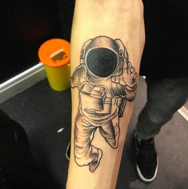 男生手臂上黑灰点刺简单线条人物宇航员纹身图片