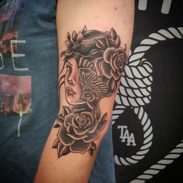 女生手臂上黑色点刺简单线条花朵和人物纹身图片