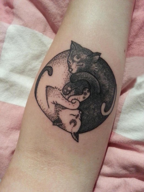 女生手臂上黑色点刺简单线条小动物猫咪纹身图片