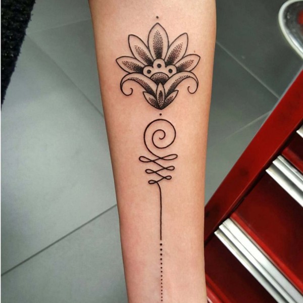 女生手臂上黑灰素描点刺技巧文艺莲花纹身图片
