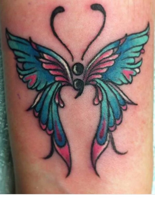 女生手臂上彩绘水彩素描创意文艺蝴蝶冒号纹身图片