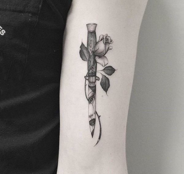 女生手臂上哈哈点刺简单线条植物花朵和匕首纹身图片