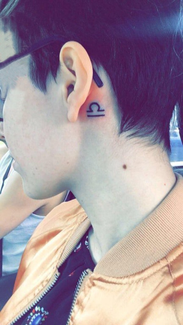 女生耳后黑色简单线条创意星座天秤座纹身图片