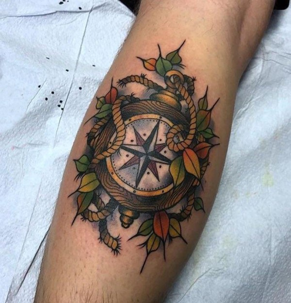 男生小腿上彩绘简单线条植物叶子和指南针纹身图片