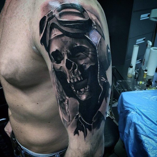 男生手臂上黑灰素描点刺技巧创意骷髅纹身图片