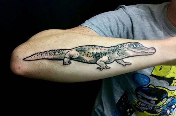 男生手臂上黑灰点刺简单线条小动物鳄鱼纹身图片