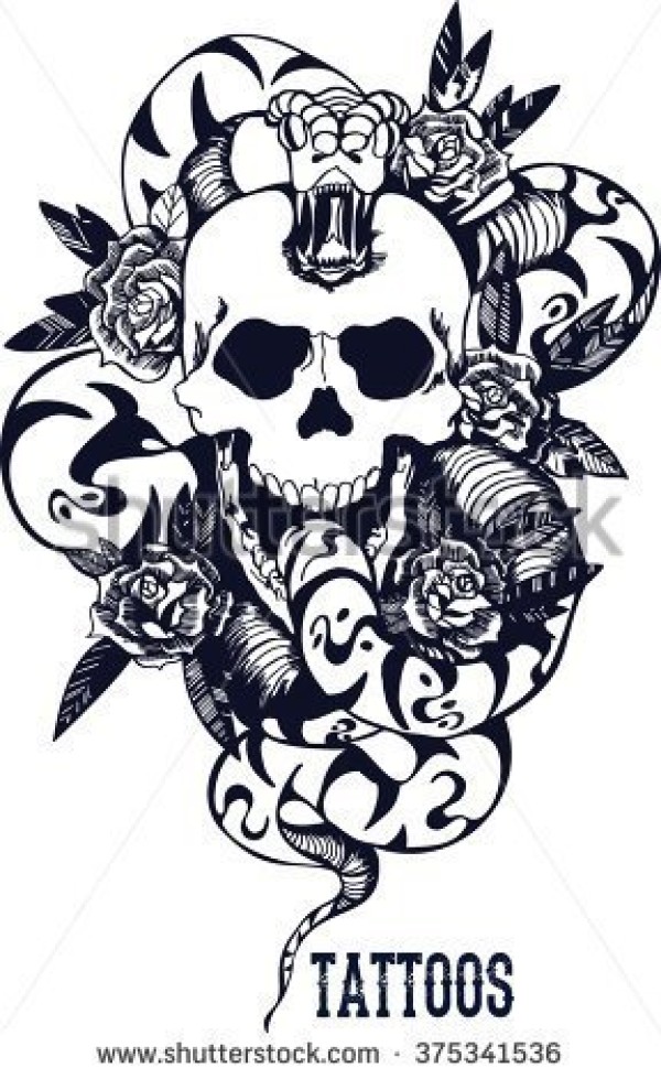黑灰素描创意霸气骷髅蛇图腾纹身手稿