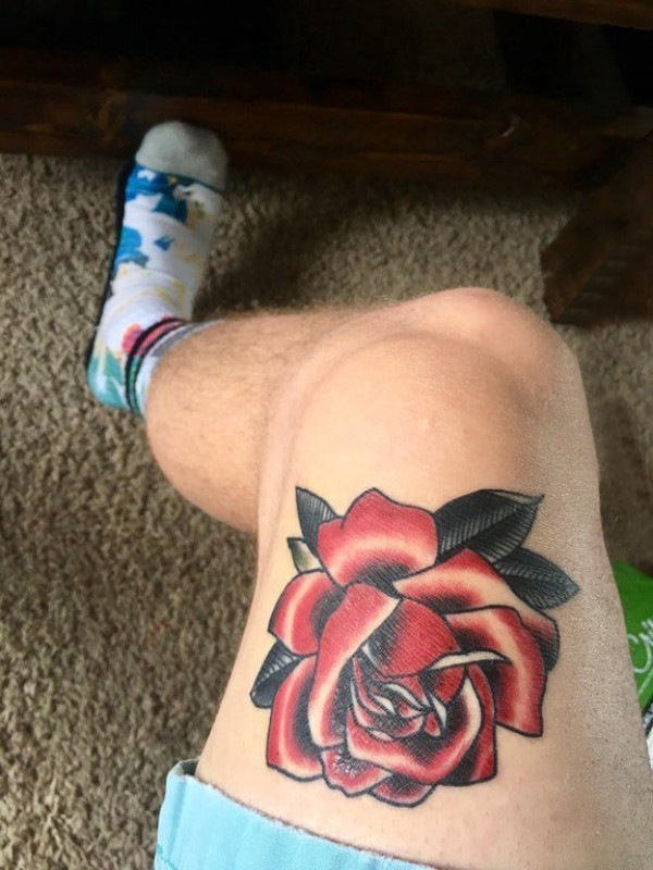 男生大腿上彩绘渐变简单线条植物玫瑰纹身图片