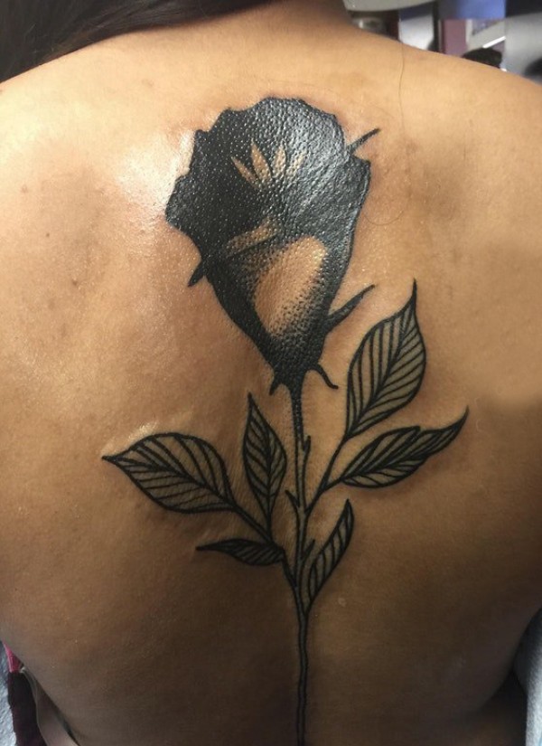 女生后背上黑色点刺简单线条创意植物花朵纹身图片