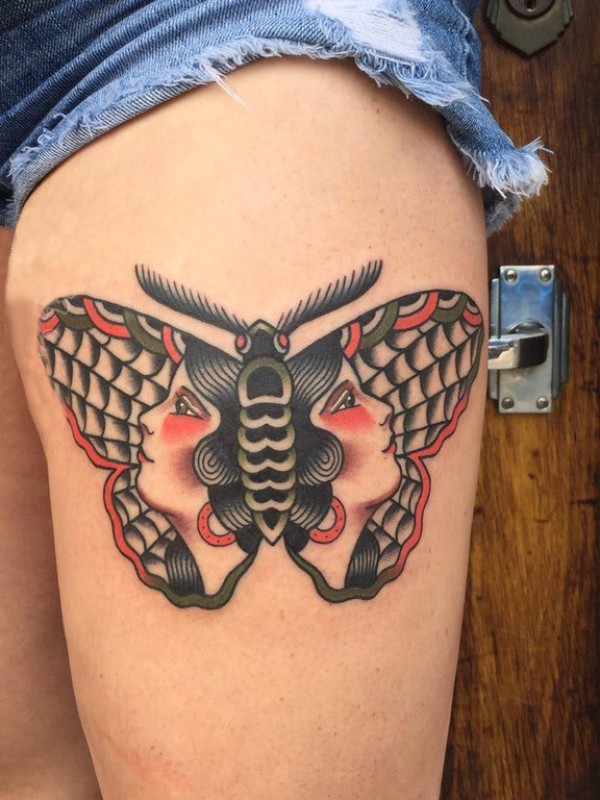 女生大腿上彩绘几何简单线条小动物蝴蝶和人物纹身图片