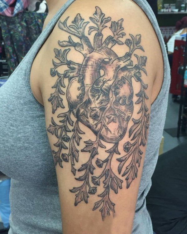 女生手臂上黑灰点刺抽象线条植物和心脏纹身图片