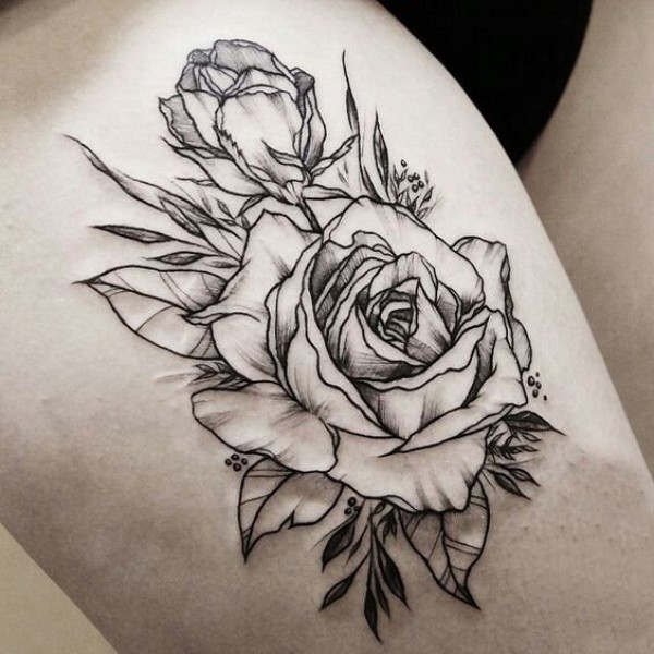 女生大腿上黑灰素描点刺技巧创意唯美花朵3d纹身图片