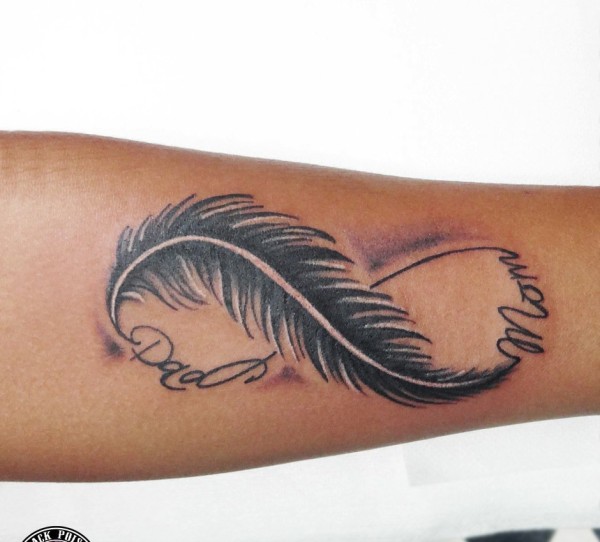 男生手臂上黑灰素描点刺技巧创意羽毛纹身图片