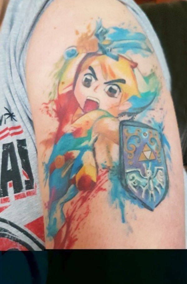 男生手臂上彩绘泼墨简单线条卡通人物纹身图片