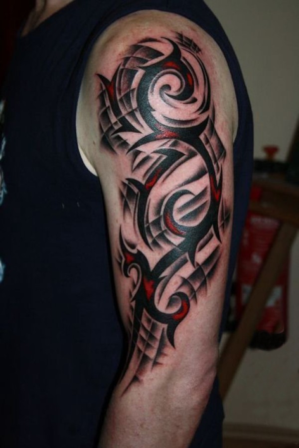 男生手臂上红黑素描创意经典图腾花臂纹身图片