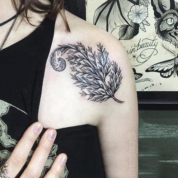 女生肩部黑色点刺简单线条创意植物叶子纹身图片