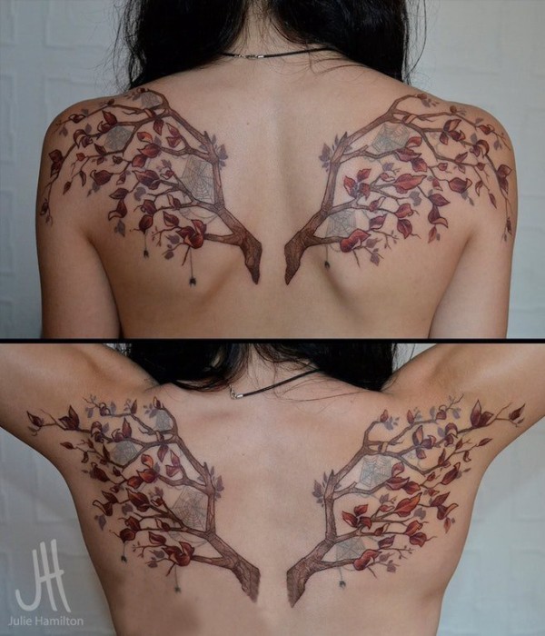 女生后背上彩绘渐变简单线条植物树枝和花朵纹身图片