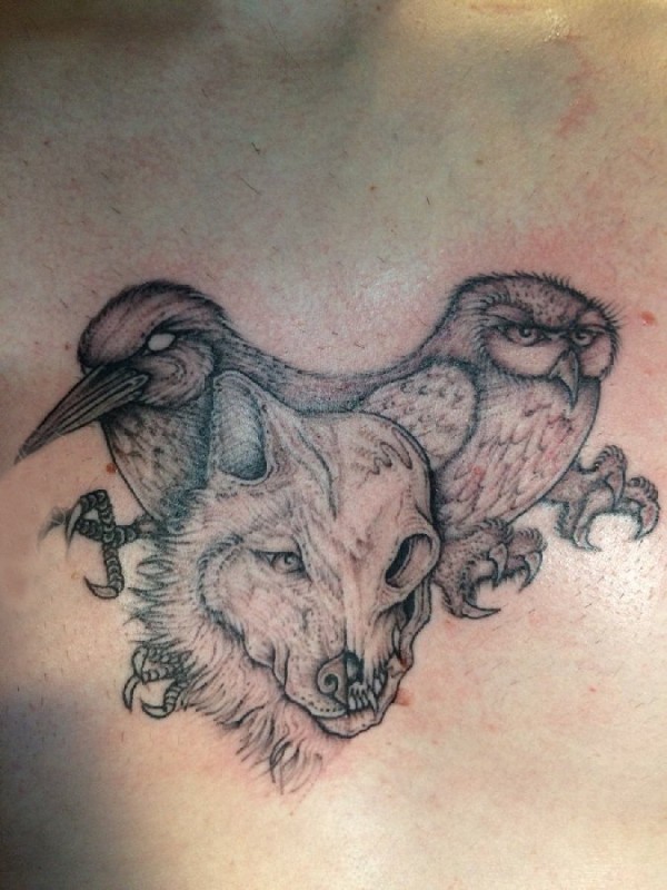男生胸部黑灰点刺简单线条小动物鸟和狼纹身图片