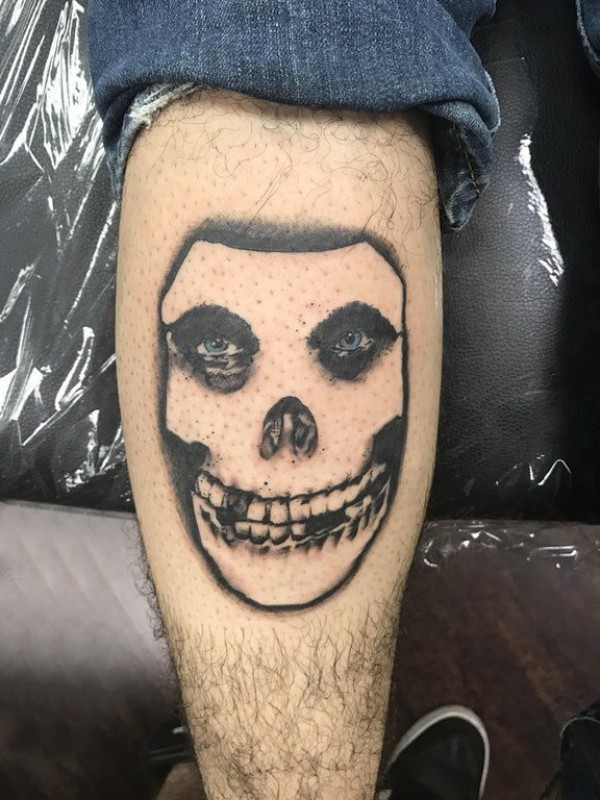 男生小腿上黑色点刺几何简单线条面具纹身图片
