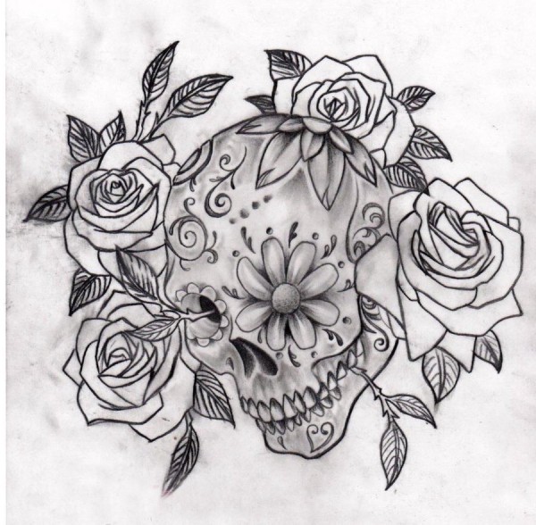 黑灰素描创意恐怖骷髅唯美花朵创意纹身手稿