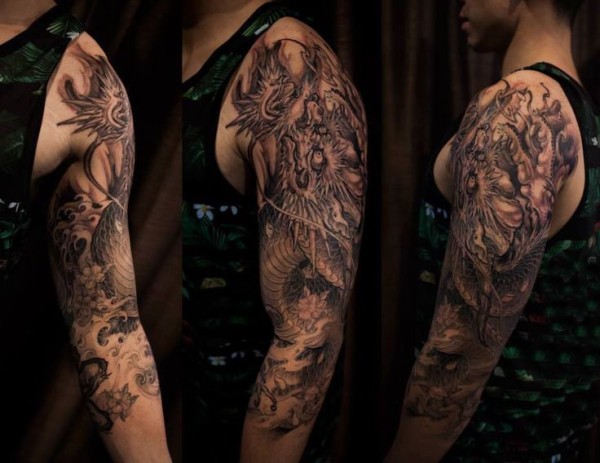 男生手臂上黑灰素描点刺技巧创意霸气龙图腾花臂纹身图片