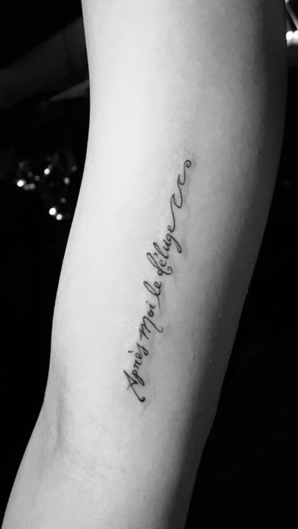女生手臂上黑色抽象线条有意义的花体英文纹身图片