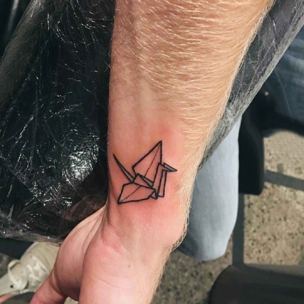 男生手腕上黑色几何简单线条千纸鹤纹身图片