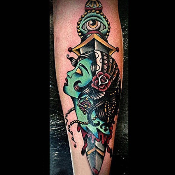 男生手臂上彩绘水彩素描创意恐怖匕首纹身图片