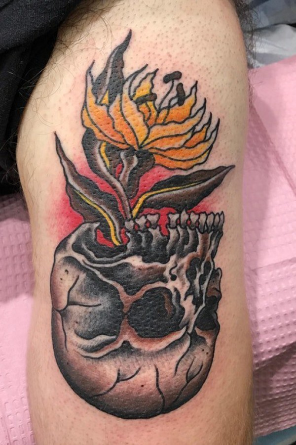 男生手臂上彩绘渐变简单线条植物花朵和骷髅纹身图片