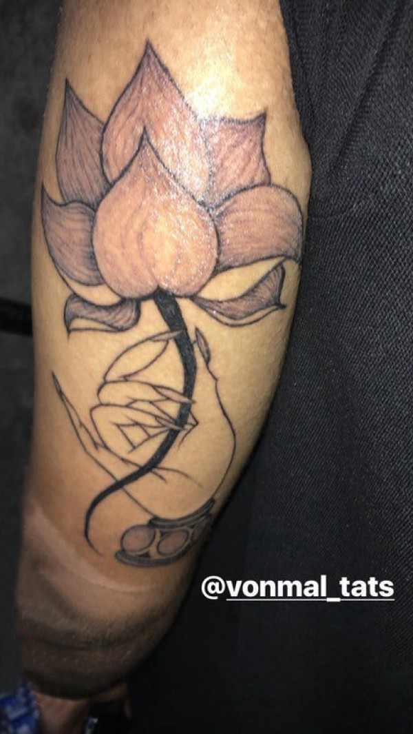 男生手臂上黑灰点刺简单线条植物莲花纹身图片