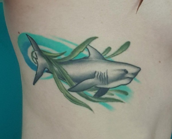 男生侧腰上彩绘渐变简单线条植物水草和鲨鱼纹身图片