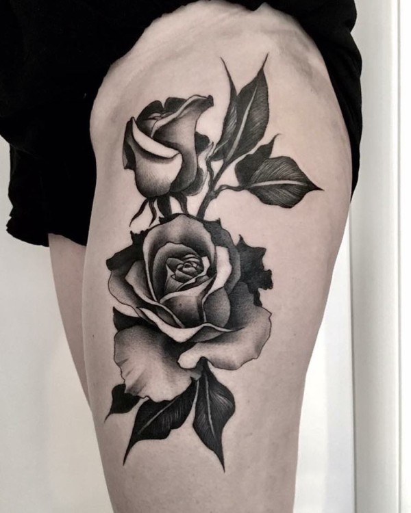 女生大腿上黑灰素描点刺技巧创意唯美精致玫瑰纹身图片