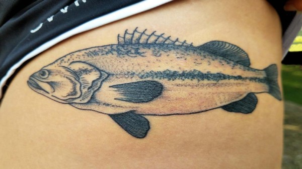 女生大腿上黑灰点刺简单线条小动物鱼纹身图片